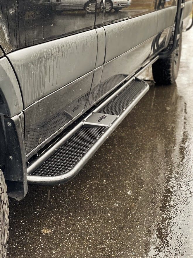 Our Sprinter Nerf Bar Side Steps are a must-have accessory for anyone looking to make getting in and out of their van easier and safer. With their durable construction and non-slip Perforated Traction Tread steps, you'll be able to confidently step up into your van without worrying about slipping or falling. Plus, they add a sleek and stylish look to your van. Don't miss out on the convenience and safety of our Nerf Bar Side Steps.